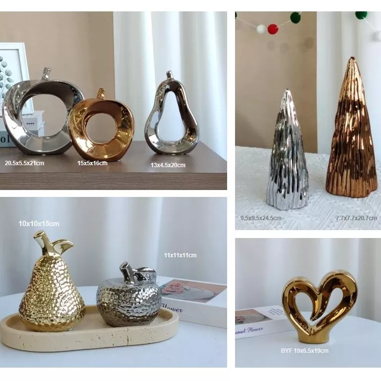 ຜູ້ອອກແບບເຊລາມິກພິເສດຂອງ Byf ມີຫມາກຜົນ, ຕົ້ນໄມ້ວັນຄຣິດສະມາດ, ແລະຫົວໃຈ. ເຮັດດ້ວຍເຊລາມິກ, ພວກມັນໃຊ້ເທັກນິກທີ່ເປັນເອກະລັກເພື່ອສ້າງໂລຫະທີ່ມີໂລຫະ, ມີຢູ່ໃນຄໍາແລະເງິນ. ການອອກແບບຫມາກໄມ້ (Apple ແລະ Pear) ມີສາຍກ້ຽງ, ມີການຕັດແລະເຄື່ອງຕັດຫຍິບທີ່ເປັນເອກະລັກ; ຕົ້ນໄມ້ວັນຄຣິດສະມາດແມ່ນສາມມິຕິ, ມີໂຄງສ້າງທີ່ອຸດົມສົມບູນ; ແລະຫົວໃຈແມ່ນງ່າຍດາຍແລະສະຫງ່າງາມ, ໃຫ້ກູ້ການສໍາພັດກັບຄວາມຮັກ. ຊິ້ນສ່ວນທີ່ມີຄວາມຫລູຫລາທີ່ສະຫງ່າງາມເຫລົ່ານີ້ແມ່ນດີເລີດສໍາລັບຫ້ອງຮັບແຂກຫລືໂຕະຂອງທ່ານ, ເພີ່ມການສໍາພັດຂອງ flair ສິລະປະແລະຮູບແບບຂອງທ່ານ. ພວກເຂົາເຈົ້າທີ່ມີອຸປະກອນເສີມທີ່ຖືກປັບປຸງໃຫມ່ທີ່ຊ່ວຍເພີ່ມຄວາມທະເຍີທະຍານຂອງພື້ນທີ່ໃດຫນຶ່ງ.
